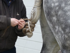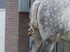 Eventueel vlecht je het bovenste deel van de staart in, maar dit hoeft niet. Daarna verdeel je de staart in drie plukken.