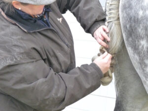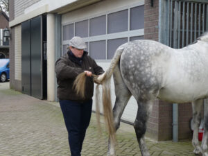 Je begint met een uitgeborstelde, maar liefst niet schone staart (klinkt gek, maar een gewassen staart, of nog erger: behandeld met bv. cowboy magic, dat is te glad, dan blijft de knot niet zitten).